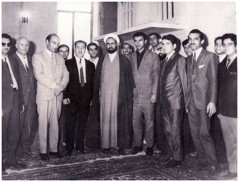 از سمت چپ نفر سوم دکتر شریعتی و نفر پنجم شهید مطهری در حسینیه ارشاد