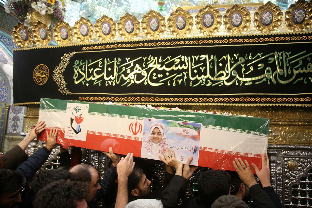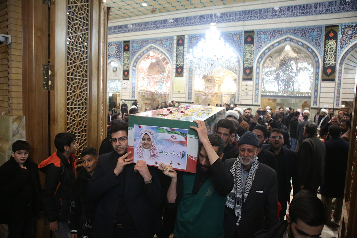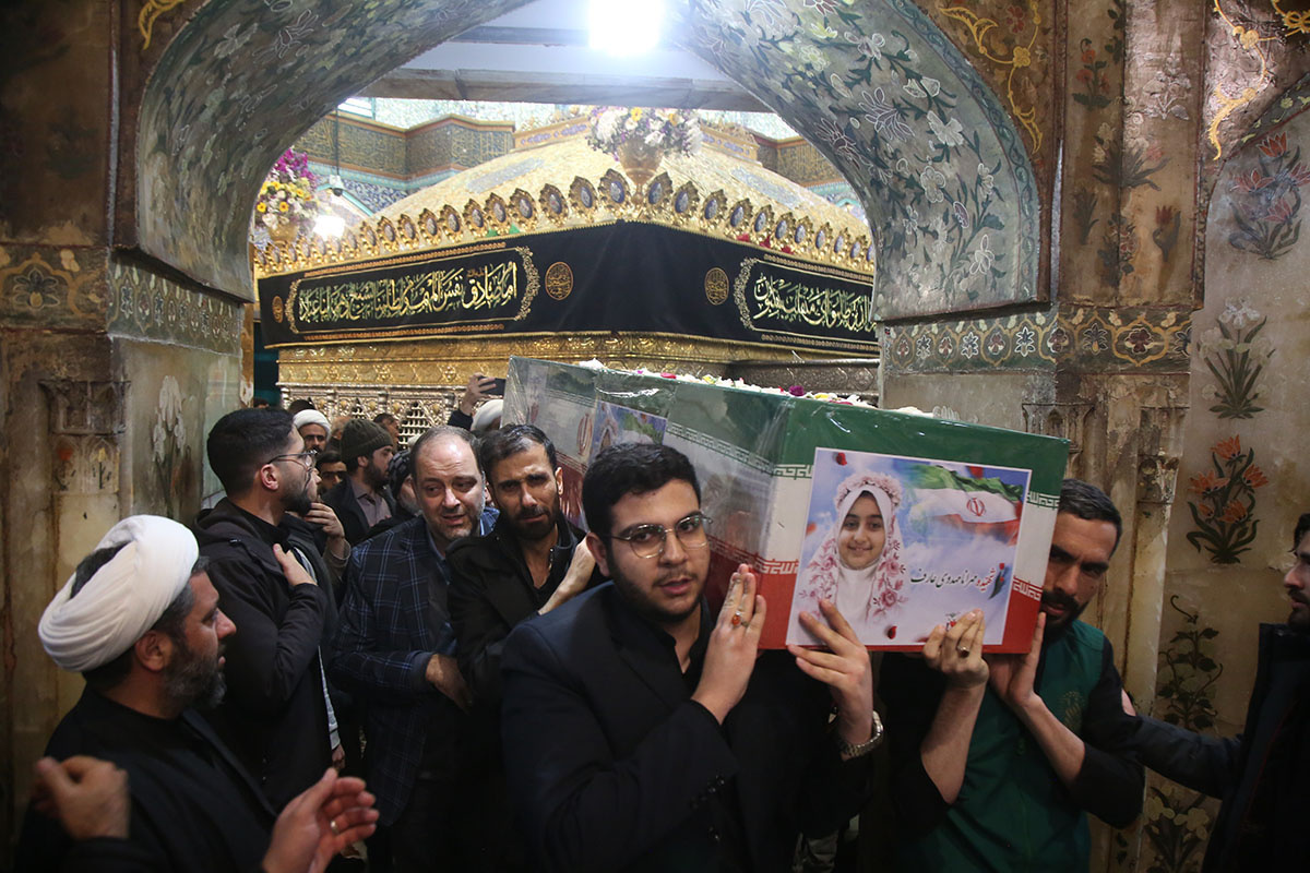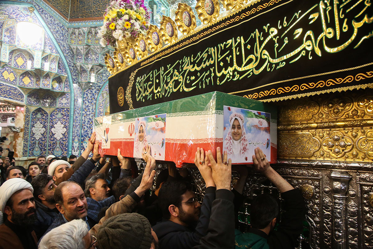 آیین وداع با پیکر مطهر هفت شهید حملات وحشیانه آمریکا و رژیم صهیونیستی به مناطق مسکونی شهر مقدس قم از جمله سه زن و یک کودک با حضور پرشور مردم در حرم مطهر حضرت فاطمه معصومه سلام الله علیها برگزار شد.